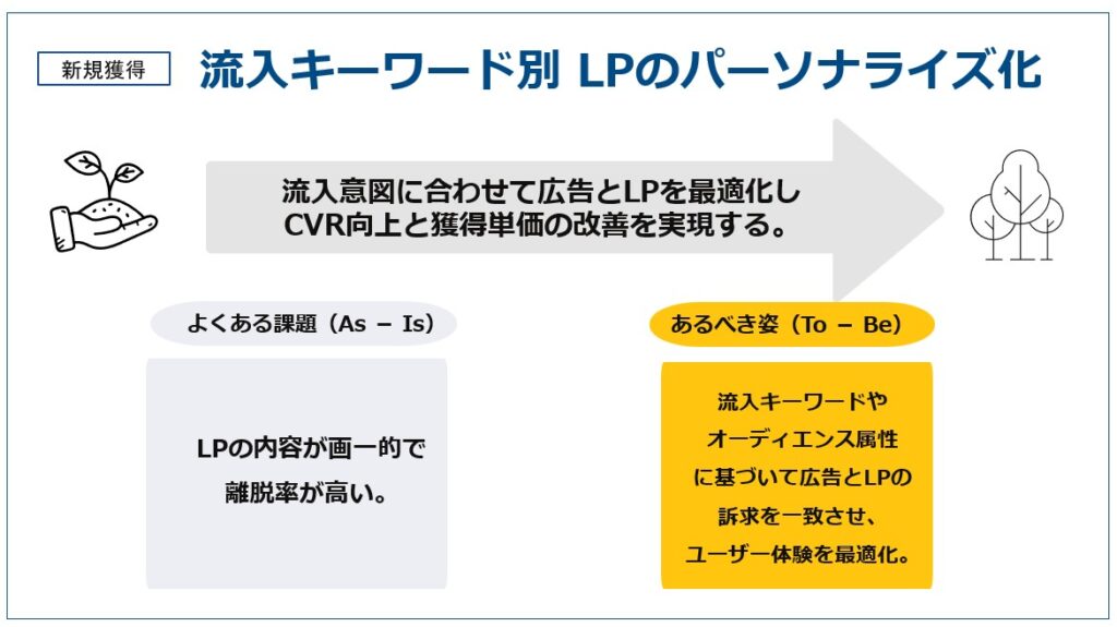 そこで今回紹介したい打ち手は「流入キーワード別にLPをパーソナライズ化」を提言・解説していきます。
