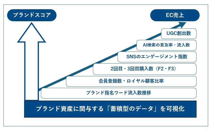 これまで、ブランドの価値は目に見えにくく、評価しにくいという課題がありました。しかし、ブランド公式ECに「蓄積される顧客の行動データ」を正しく分析すれば、売上などの短期的な指標だけでは測れない「ブランドの基礎体力」を可視化・評価し、コントロール可能な状態にすることができます。ブランド公式ECを「資産蓄積の場」として正しく評価・管理し、ブランドスコアという指標を持つことで、企業は「なぜ顧客が自社を選んでくれるのか」という根源的な問いにデータで評価することが可能になり、結果としてECサイト経由の継続的な売上拡大に繋がっていきます。