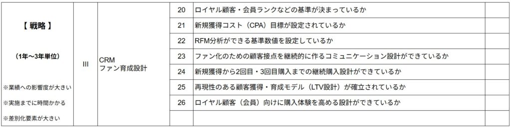 3回目は、重要度Ⅱ【戦略的項目】の「CRM・ファン育成設計」のチェック項目の活用ポイントになります。