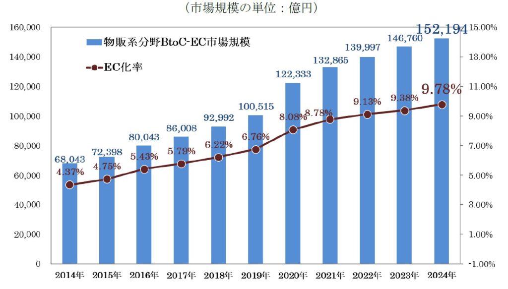 2020年から2025年にかけては、コロナ禍による巣ごもり消費の影響もあり、EC利用者が増加しました。直近の経産省統計でも物販EC市場は約15兆円規模に成長しています。