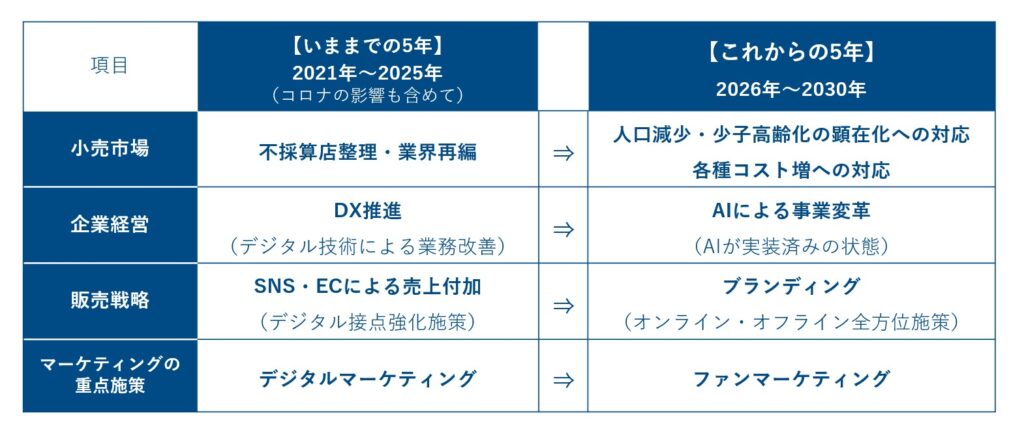 ここ5年はデジタル技術・デジタルマーケティング手法を「いち早く取り込む」時期でしたが、これからはすべての企業に於いて、AI技術を取り入れつつ「ブランディング×個々の顧客との継続的なつながり」を作るマーケティング活動が中心になり、それに伴い、ビジネスモデルの再定義やマーケティング手法の見直しが進むと予測しています。
