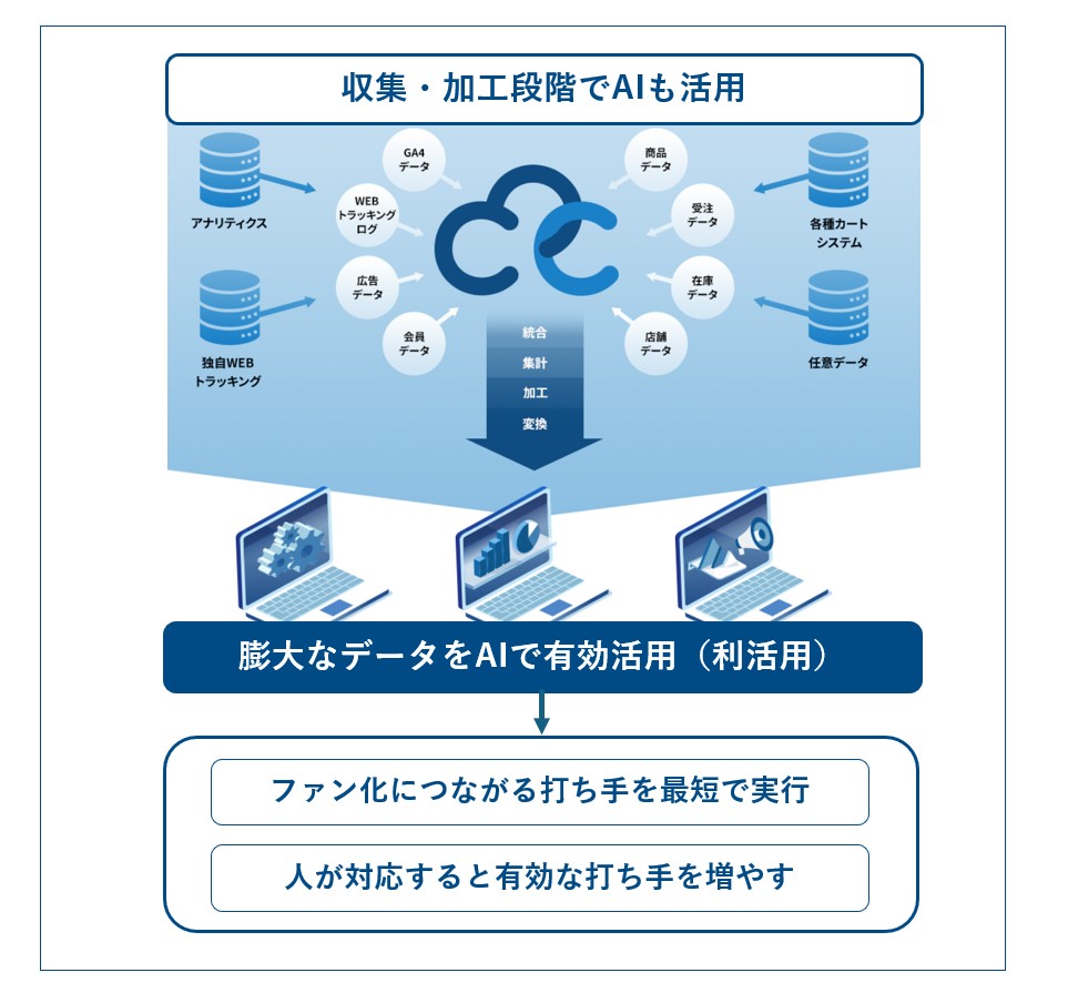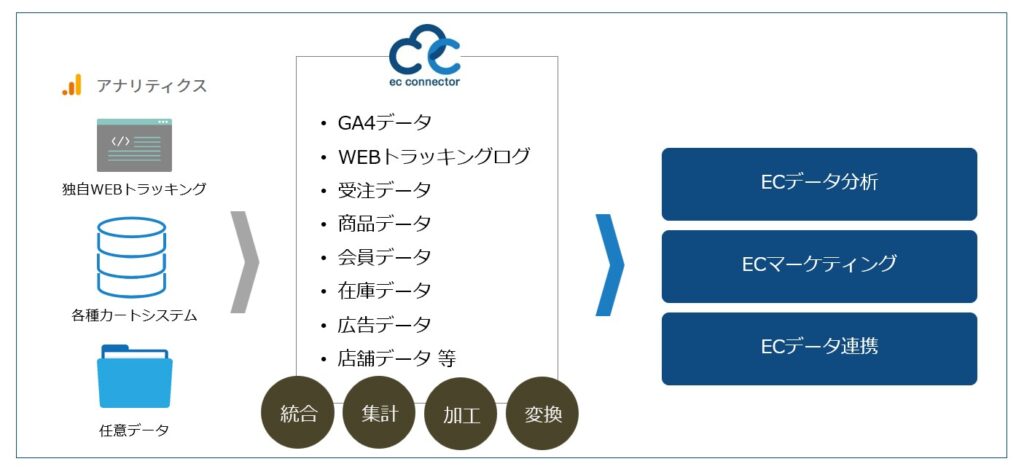 各種システム・分析ツールを統合・集計・加工・変換するイメージ