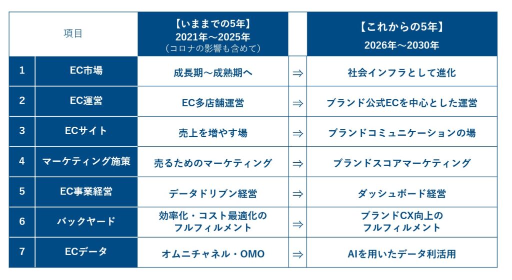 以上、転換点を迎えたEC事業のここ5年の動向を踏まえ、2030年を視野に入れたECの未来予測として7つのキーワードを提示・解説しました。