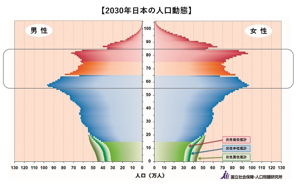 65歳以上の市場 国立社会保障・人口問題研究所の予測によると、2030年には日本の総人口の約30.8%(3,716万人)が65歳以上になります。また、60歳前後の団塊ジュニア世代も含めると、非常に大きなマーケットになります。必ずしも消費支出が増えるとは限りませんが、5年後のこの世代はSNSやデジタル操作に抵抗が少なく、PC・スマホでの情報収集や購入が日常化している層が多く含まれます。約3,000万人を超える市場を視野に入れ、新規参入も含めて準備を進めたいところです。