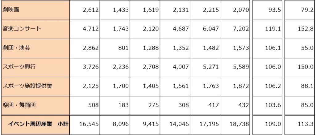 特に 音楽コンサート、スポーツ興行、スポーツ施設提供業の伸び率は高く、野球・サッカーだけでなく各地でバスケットのBリーグなど含めた地域と連動したスポーツイベント市場はこれから伸びていくと考えられます。