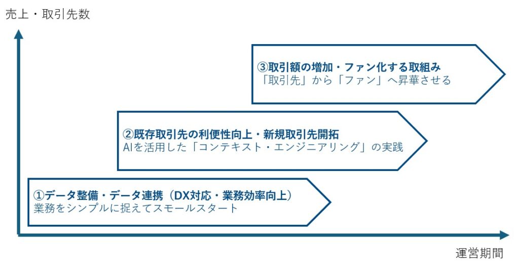 これからのBtoB ECの導入は、単なる「注文の手間を減らす便利な発注ツール」ではなく、AIの技術も活用しながら顧客のニーズを先読みし、「企業のファンを増やす」ビジネスパートナーにする視点が必要です。