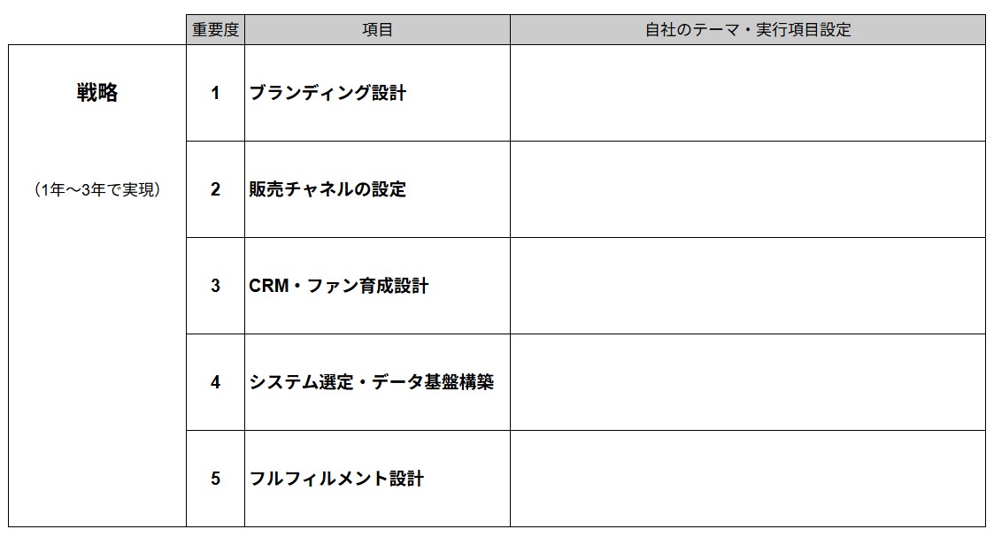 | 1.ブランディング設計 2.販売チャネルの設定 3.CRM・ファン育成設計 4.システム選定・データ基盤構築 5.フルフィルメント設計 |