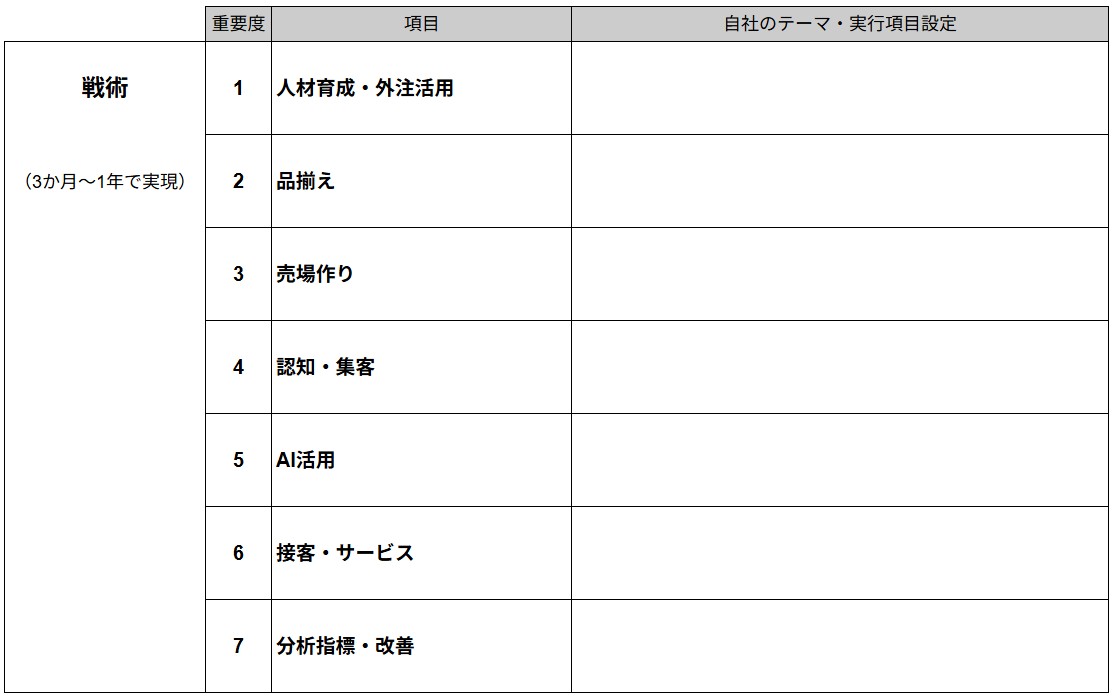 | 1.人材育成・外注活用 2.品揃え 3.売場作り 4.認知・集客 5.AI活用 6.接客・サービス 7.分析・改善 |