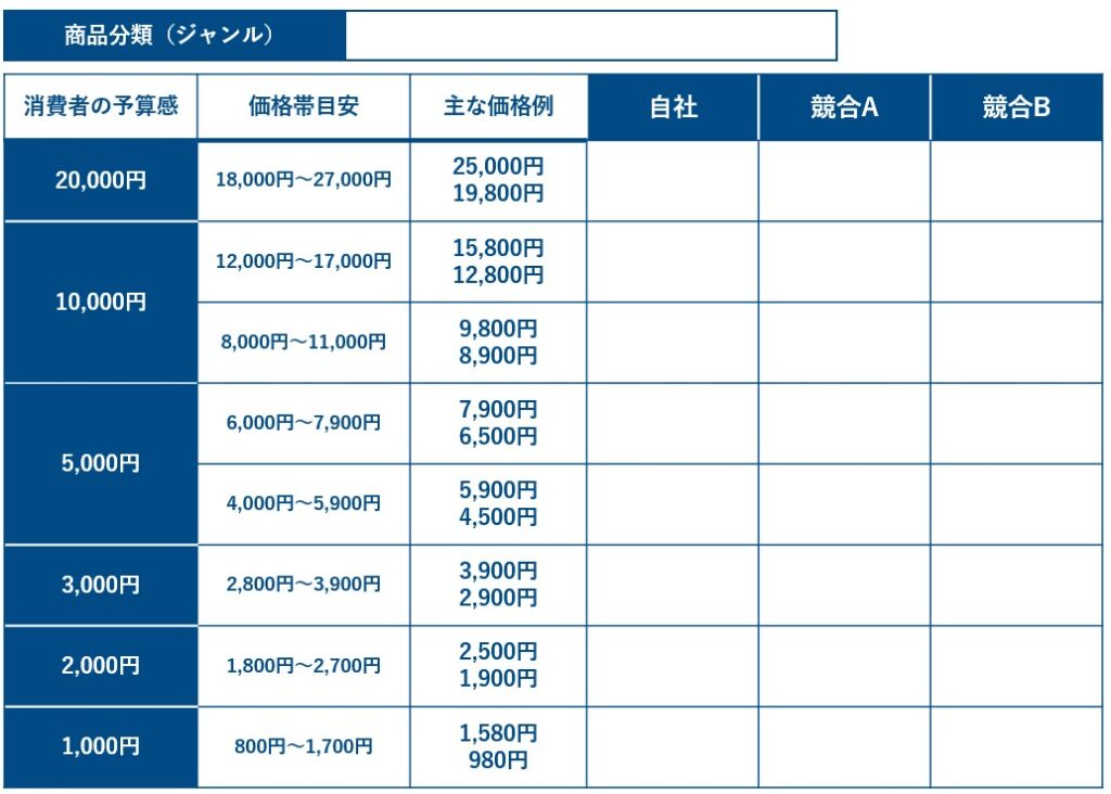 シートに設定する価格帯は、消費者が購入を迷ったり決定したりする際の心理的な境界線の目安として想定してください。この価格帯に沿ってアイテム数を確認すると、自社と競合の品揃えの差が明確になります。