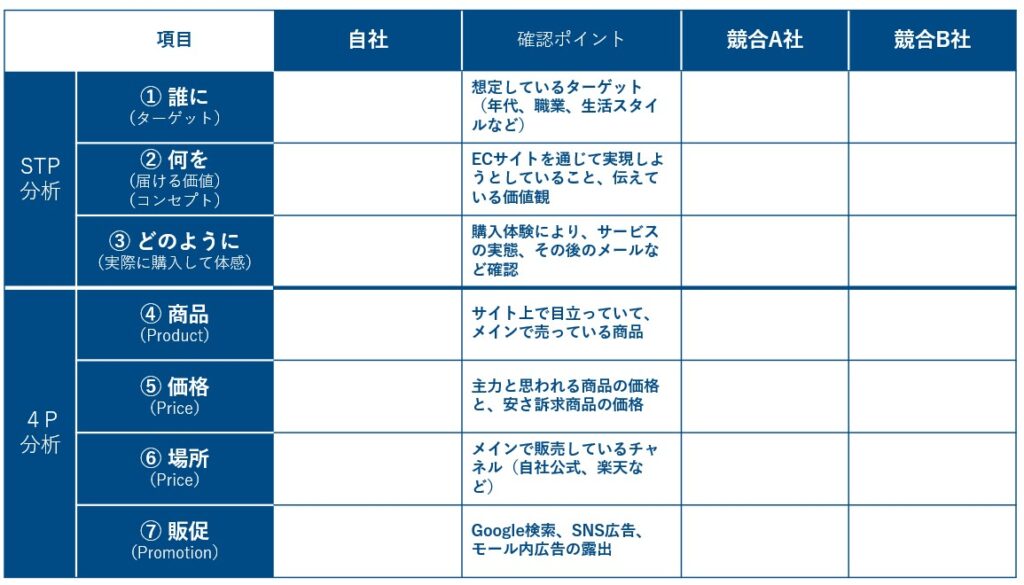 まずは自社および確認対象となる競合店舗を2店程度選定し、STP分析(S: Segmentation=市場の細分化、T: Targeting=ターゲット選定、P: Positioning=ポジショニング)をベースに整理します。確認ポイントは次の3点です。