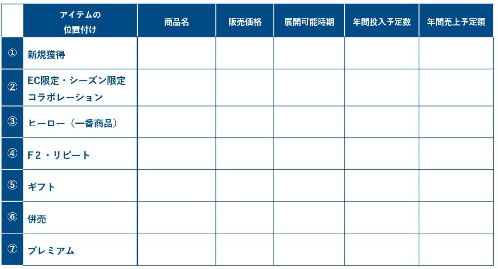 ブランド公式オンラインショップの売上を継続的に伸ばして、商品販売を通してファンを増やしていくことを想定した7つの商品の役割を確認シートに沿って決定していただくフレームワークを提示しますので活用ください。
