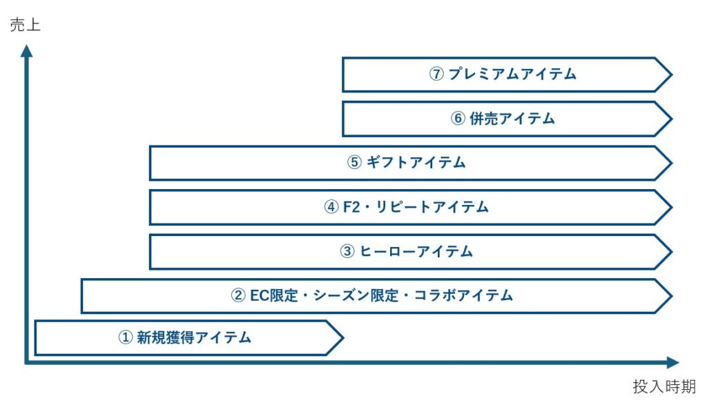 新規獲得アイテムと近い役割を持ちますが、ブランド公式サイトが選ばれる理由や認知のきっかけを増やすアイテムとして位置づけます。実店舗にないオリジナルの「EC専用アイテム」、ECで先行販売または数量限定販売する「シーズン限定アイテム」、キャラクターや著名人、他ブランドと組む「コラボレーションアイテム」などを開発・設定します。この商品はSNSやメディアなどでも話題性含めて広がることも想定して企画・開発していきます。