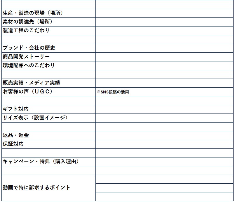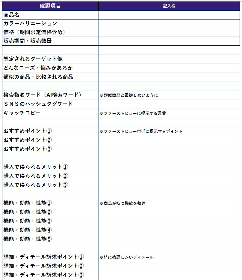 このようなメリット・デメリットを踏まえ、ブランド公式ECサイトの商品ページで訴求する写真や動画素材を集め、デザインに入る前に確認シートにて漏れなく記入して訴求要素を整理することが重要です。そうすることで、会社としてのノウハウを蓄積でき、公開後の検証・改善にあたって関係者間で共通認識を持ちやすくなります。