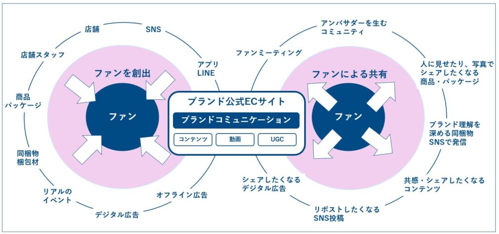 【ブランド公式ECサイトを起点に、ファンの創出とファンによる共有のイメージ図】