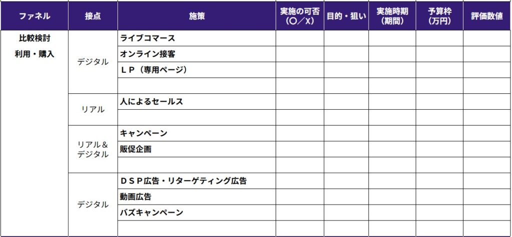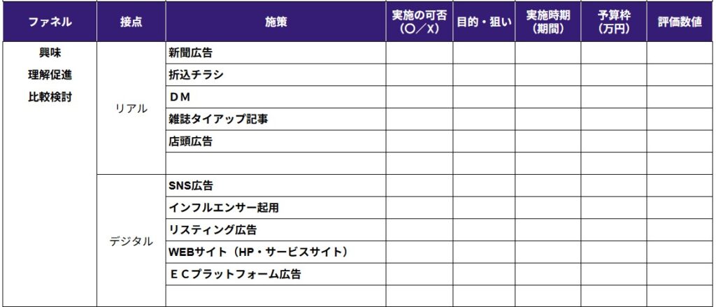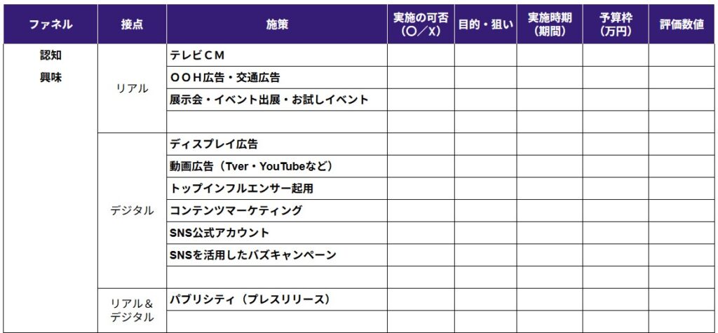 ECサイトの認知・売上拡大に向けて費用をかけたプロモーション施策を立案するプロセスとして、まずは多くのマーケティング活動で用いられる「行動・心理ファネル」(認知・興味・理解促進、比較検討、利用・購入、ファン化・継続)に沿って整理します。施策は、リアルプロモーション、デジタルプロモーション、リアル&デジタルプロモーションの3分類で一覧化してください。